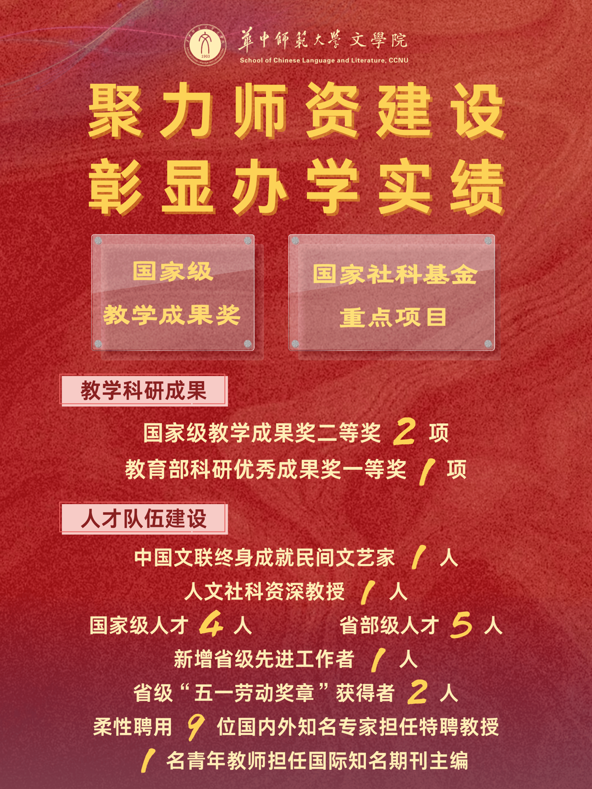 二是加大人才骨干培养力度。坚持引育并举,加强人才梯队建设,积极引进特聘教授、新进青年教师和博士后,不断优化教师队伍结构。学院先后涌现出中国文联终身成就民间文艺家1人,人文社科资深教授1人,国家级人才4人,省部级人才5人,新增省级先进工作者1人、省级“五一劳动奖章”获得者2人,柔性聘用9位国内外知名专家担任特聘教授,1名青年教师担任国际知名期刊主编。