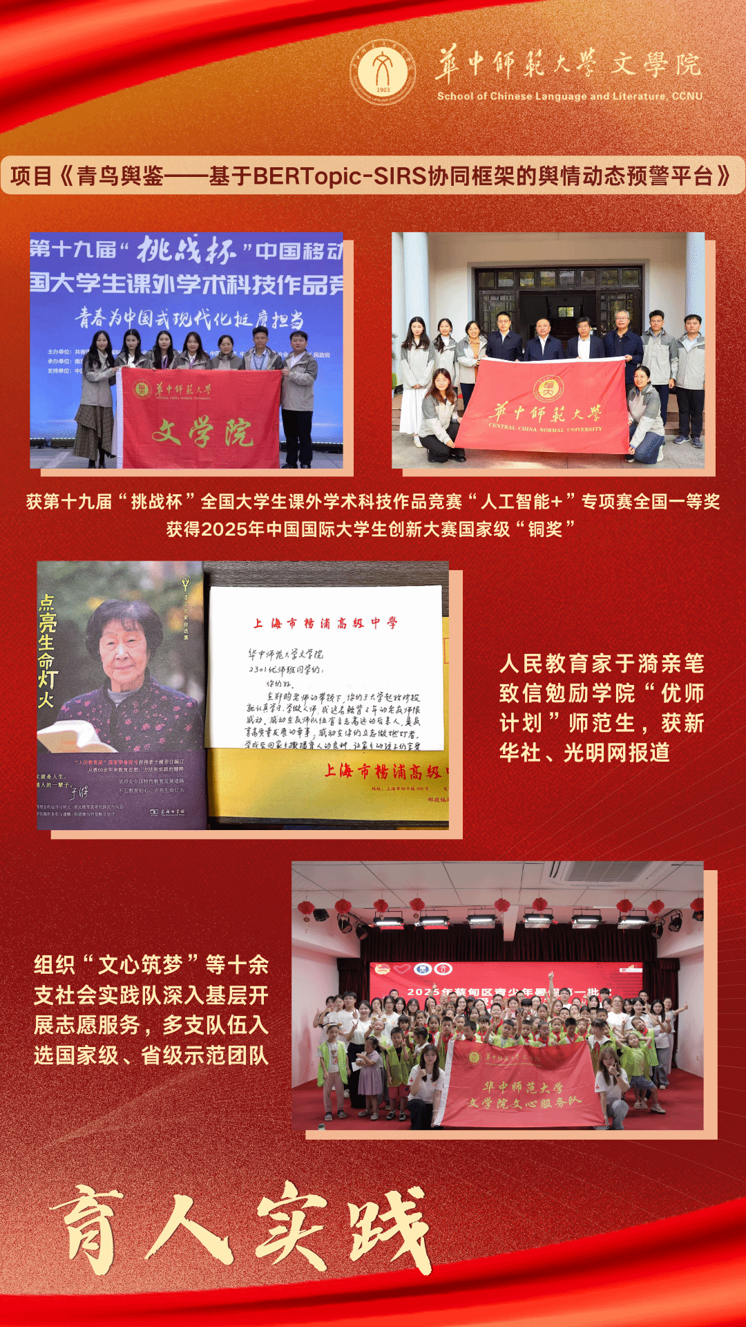 三是突出实践育人导向。积极培育和践行社会主义核心价值观,语言学教工党支部获评“全国党建工作样板支部”、离退休教工党支部获评湖北省离退休干部“示范党支部”、1个集体获评全国巾帼文明岗。服务国家战略和社会发展需求,发挥中国语言文学学科优势,成立“中国语情与舆情研究生党支部”,连续3年均有咨政报告获中央主要领导人重要批示。大力推动学生创新创业实践项目孵化,在第十三届“挑战杯”创业赛中获国赛银奖、湖北省金奖,在第十九届“挑战杯”主体赛“人工智能+”专项赛中获全国一等奖,在2025年中国国际大学生创新大赛中获国赛铜奖、湖北省金奖。组织“文心筑梦”等十余支社会实践队深入基层开展志愿服务,多支队伍入选国家级、省级示范团队,2025年暑期社会实践实现校级奖项“全覆盖”。