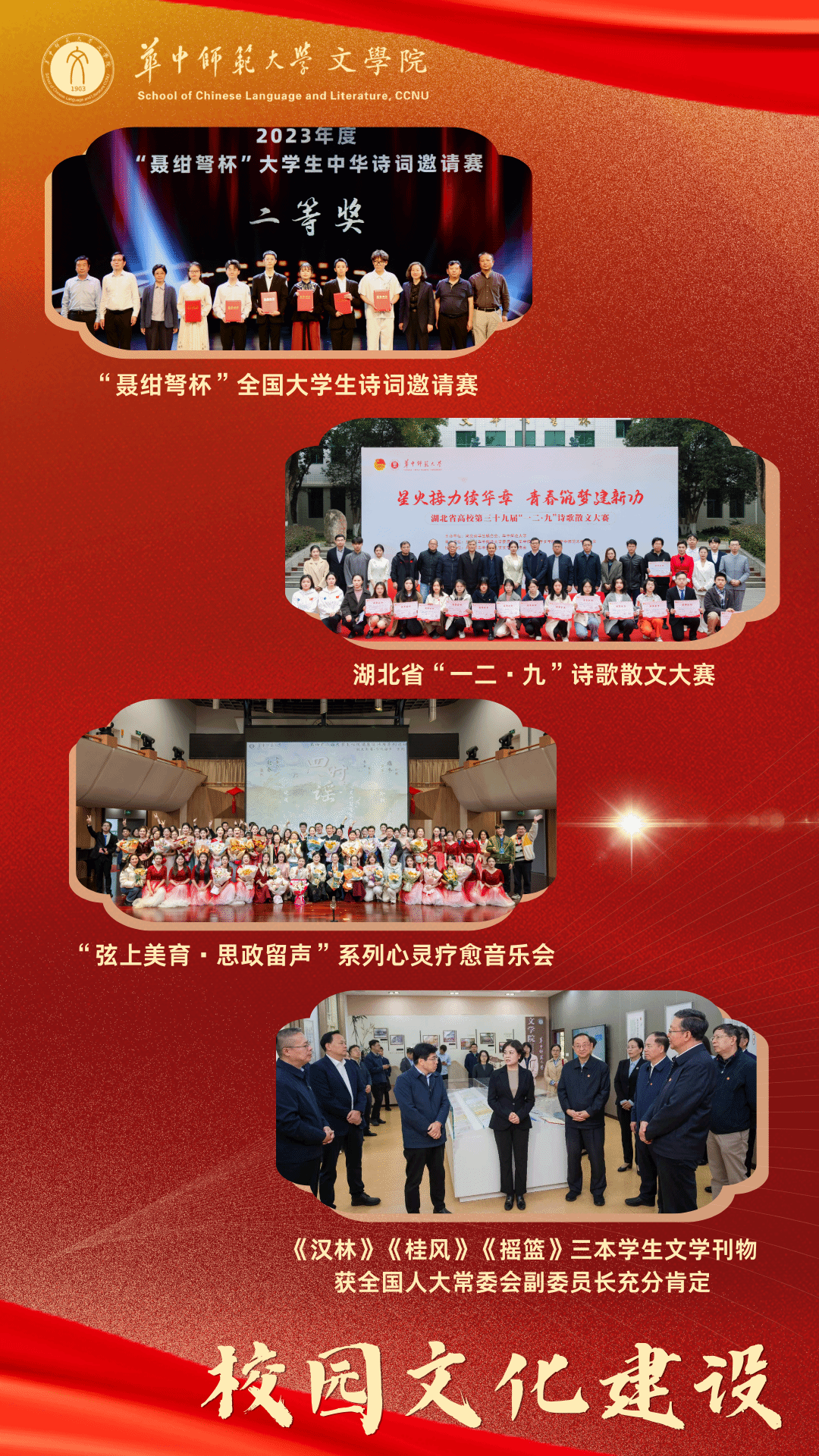 坚持践行“三全育人”教育理念,持续涵养具有鲜明人文特色的校园文化。一是高质量塑造文化品牌。连续承办“聂绀弩杯”全国大学生诗词邀请赛、湖北省“一二·九”诗歌散文大赛等大型赛事活动,获中国青年报头版专题报道,形成在全省乃至全国具有影响力的文化活动品牌。持续办好《汉林》《桂风》《摇篮》三本学生文学刊物,获全国人大常委会副委员长充分肯定。