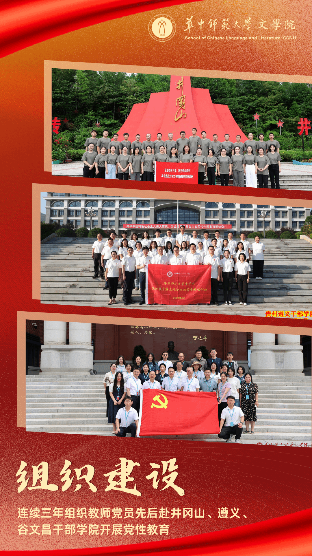始终把坚定理想信念摆在首位,系统推进师生思想政治教育和德育实践。一是健全理论武装体系。扎实开展学习贯彻习近平新时代中国特色社会主义思想主题教育,严格落实“第一议题”制度和党委理论学习中心组学习制度,出台《文学院教职工理论学习指南》。连续三年组织教师党员先后赴井冈山、遵义、谷文昌干部学院开展党性教育,严格落实“三会一课”制度,推动班子成员、支部书记讲党课全覆盖,累计授课超过300场,开展各类专题培训21次,实现师生党员全覆盖。