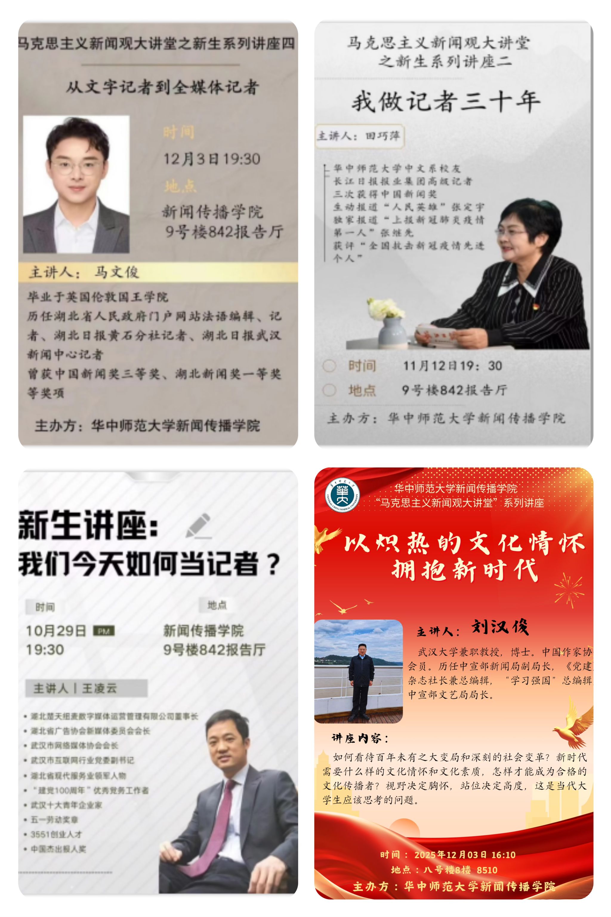 丰富师生文化生活,成立V影创作协会、立言书社、明理辩论队等学生社团,定期举办“马克思主义新闻观大讲堂”“桂子传播前沿”等活动。邀请知名记者田巧萍、知名学者朱鸿军等行业来院讲座,拓宽师生视野。组织师生参加校运动会、文艺汇演等文体活动,获2024“华大之悦”教职工羽毛球混合团体比赛第五名、2025年桂子山舞蹈大赛一等奖等荣誉。
