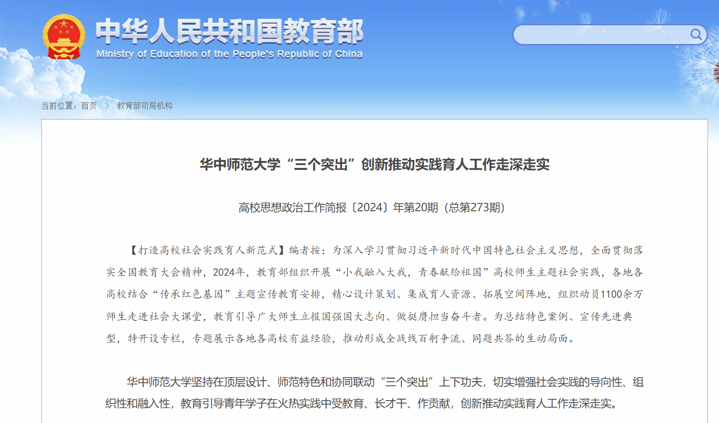 教育部简报推介华中师范大学“三个突出”创新推动实践育人工作走深走实报道