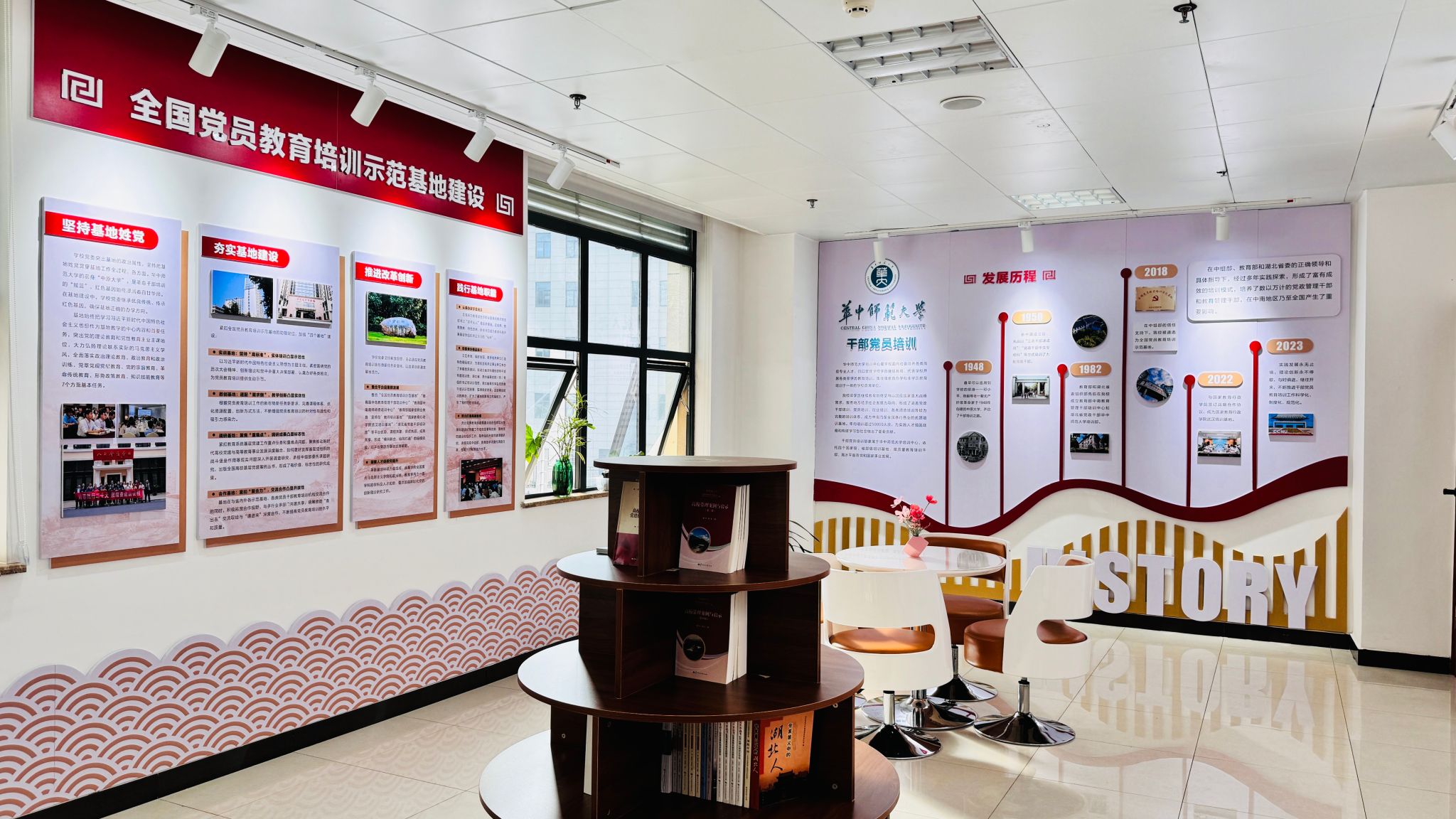 2024年6月,干部党员培训部搬迁至管理教育综合楼,集中优势资源打造专属展厅,以“初心使命”为主题,通过图文、实物、多媒体等形式展示培训成果,获中组部党教中心高度认可,成为兄弟单位调研观摩的标杆场景。展厅毗邻办公室悬挂党干培团队合影,办公桌上陈列工作纪实照片,营造温馨奋进的团队氛围;厅内藏书满柜、绿植点缀,为学员提供安心阅读、深度交流的优质空间。